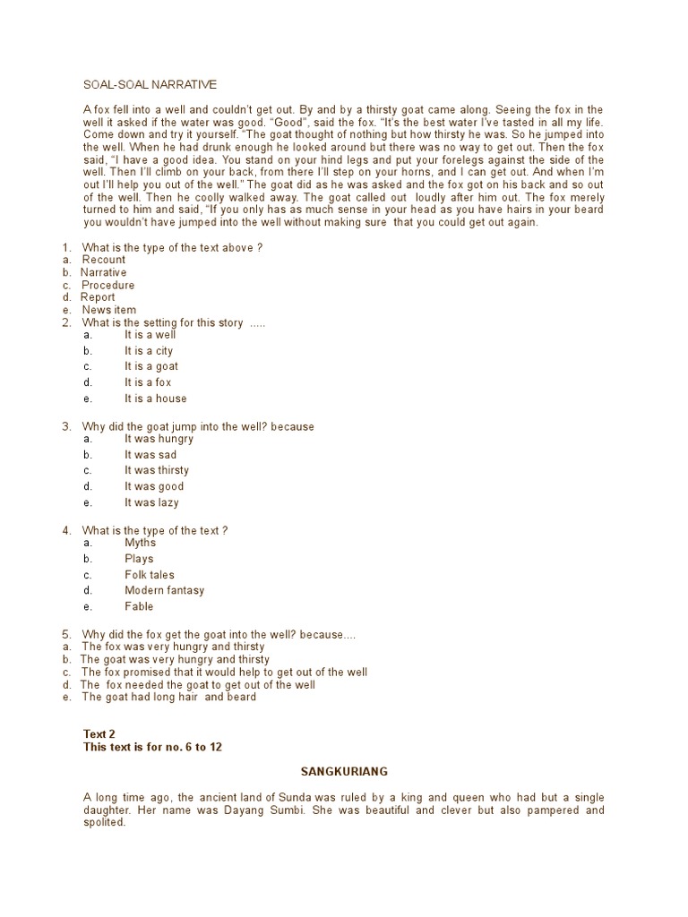 A fox fell into a well and couldn't get out. Feb 11, 2019 · pada kesempatan ini, kami berbagi soal latihan narrative text berbentuk rumpang. Berikut adalah latihan soal teks naratif khususnya legenda. Contoh soal narrative text jawaban & pembahasannya. Jul 30, 2017 · sangkuriang liked hunting very much, especially deer.